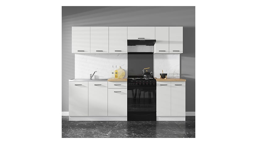Junona Line 240 cm er et komplett kjøkken som kombinerer god lagringsplass med stilrent design. Perfekt for deg som ønsker et fullt funksjonelt kjøkken på liten plass. Det er tilrettelagt for vask, komfyr og ventilator. Utførelsen gir et moderne uttrykk med kraftig materiale. Merk: Hvitevarer medfølger ikke. Junona Line finnes i flere størrelser og farger.
